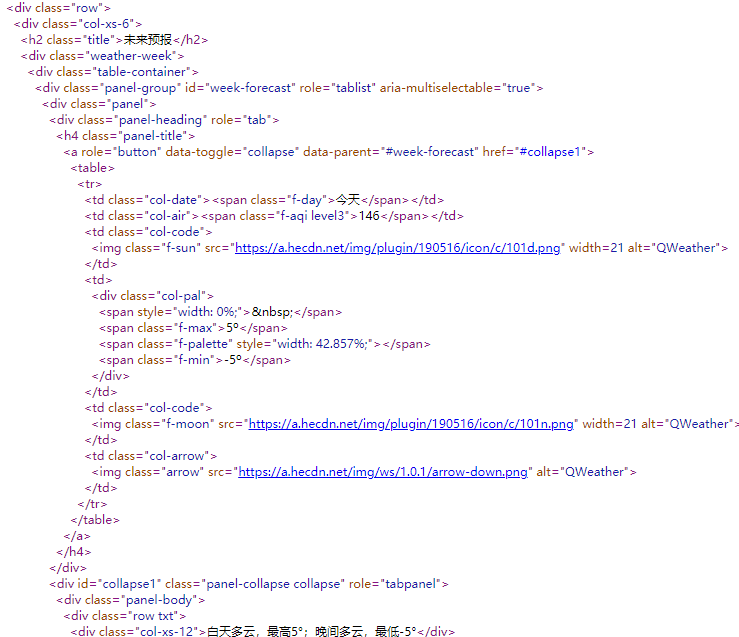 再通过网页源代码抓到未来7日的天气数据,最后整合得到最终结果。