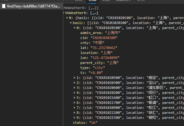 请求url是https://geoapi.heweather.net/find?key=bdd98ec1d87747f3a2e8b1741a5af796&location=上海